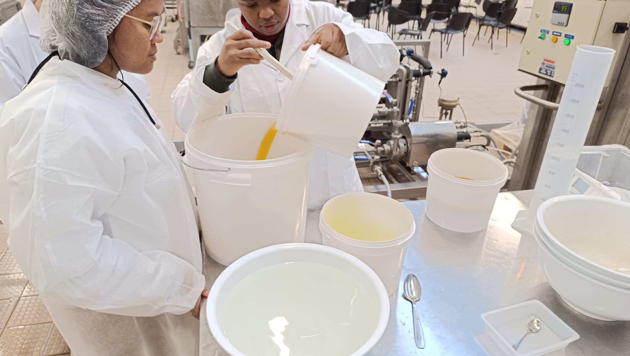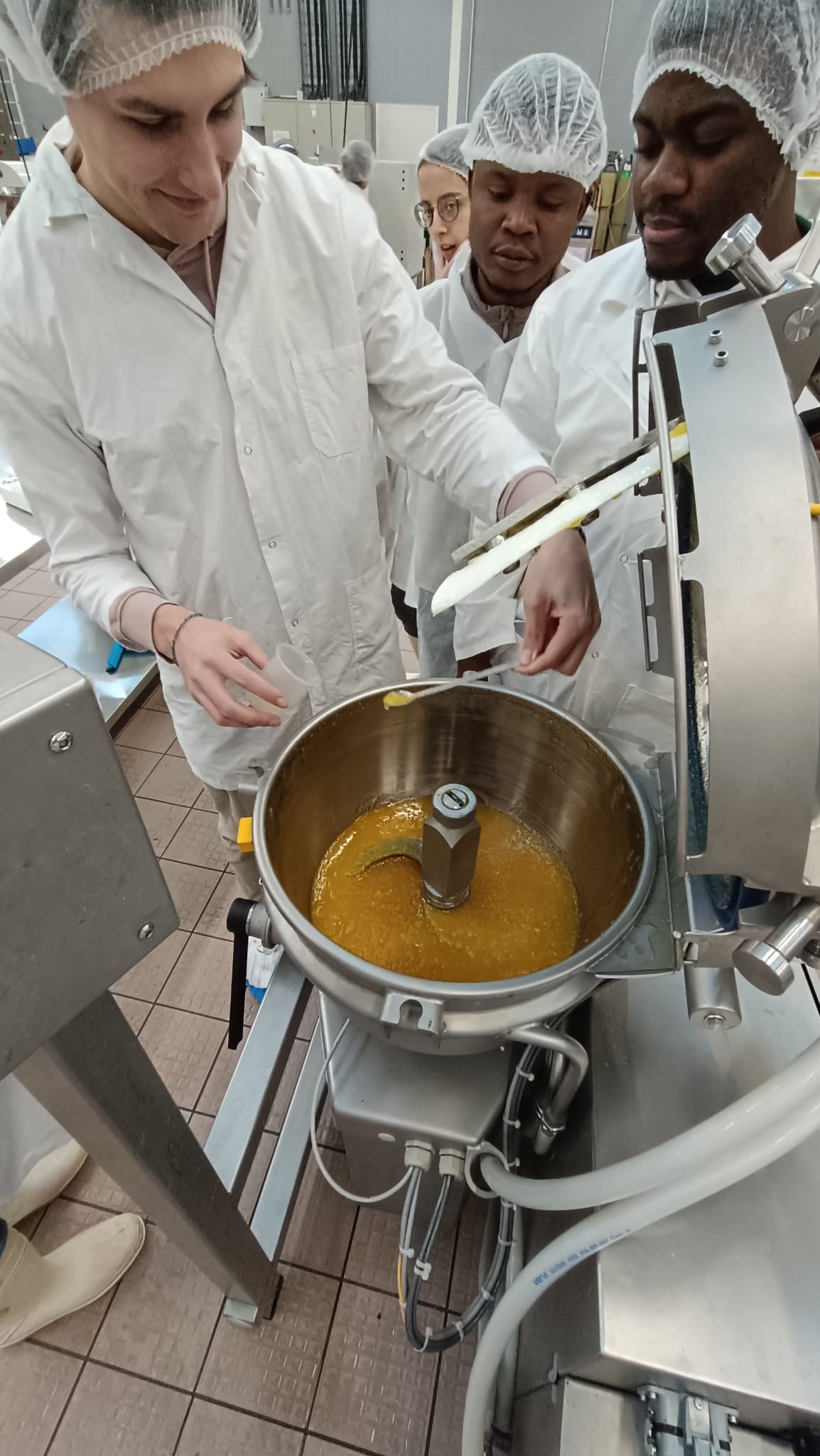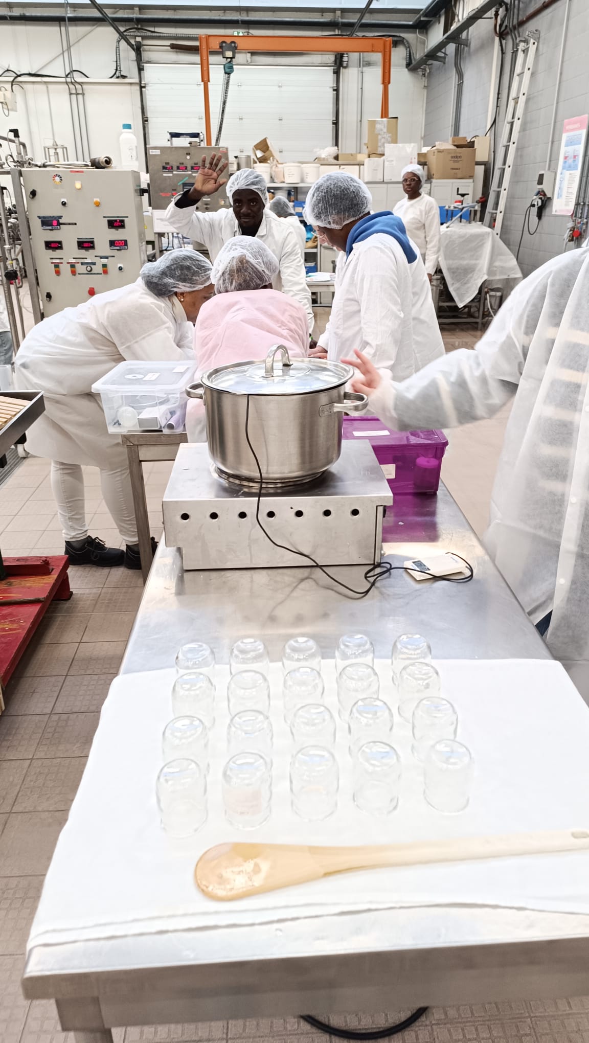 Au programme, briefing sur les règles de sécurité et d'hygiène puis production de différents produits : nectar orange ananas passion, confiture mangue ananas et lait emprésuré gélifié !